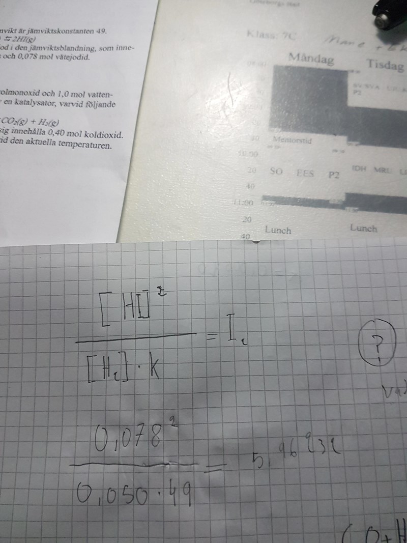 Min metod var att lösa ut I2 ur jämviktsekvationen för att räkna hur många mol av jodiden som fanns i blandningen. Tyvärr fick jag inte det svar jag önskade mig... nedanför kommer det finnas några bilder på mina uträkning vad har jag gjort för fel?