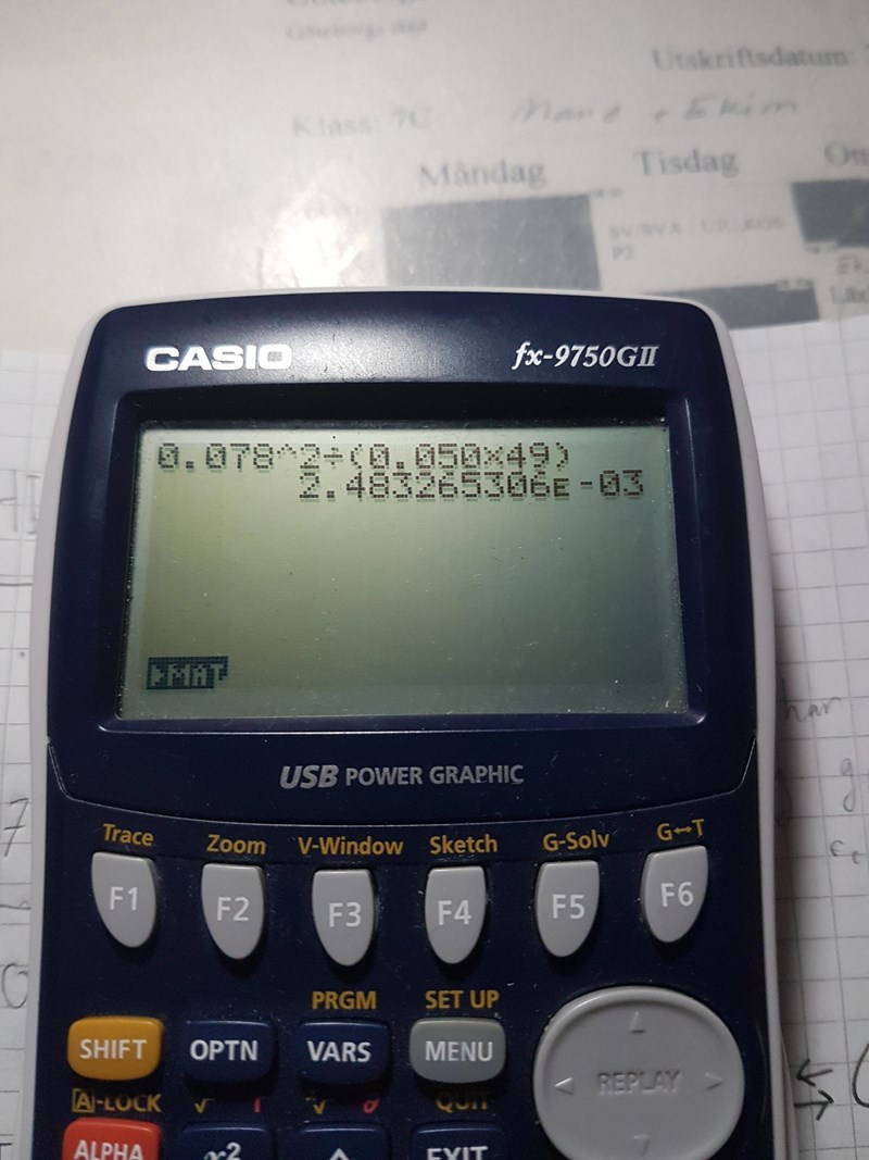 Har du glömt parentesen runt nämnaren, alternativt att man behöver skriva 0,078^2/0,050/49 för att få rätt svar?