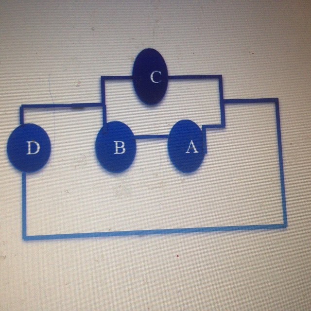 att koppla ihop ett batteri och fyra lika glödlampor, A, B, C och D.