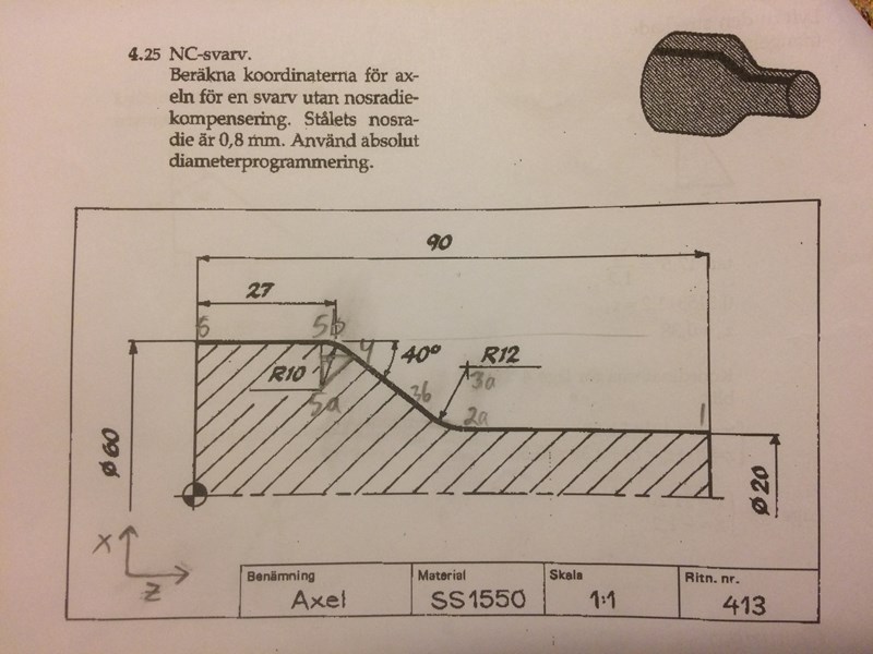 Punkterna 5a:s och 5b:s x-värden kan jag lista ut, men inte värdena för z. 5b är i x-led nerifrån räknat belägen 10 mm (halva angivna diametermåttet till höger) + 20 (skillnaden mellan halva diametermåttet till höger och nyss beräknade 10 mm) + nosradie. Allt detta ska dubbleras, eftersom halva axeln underförstått finns under den streckade vågräta linjen underst och den undre delen är identisk med den övre. Alltså ska 5b:s x-värde bli 2*(10+20)+2*0,8=61,60 mm. Där under finns 5a:s punkt med radien 10 mm och det måttet ska fördubblas eftersom ritningen skvallrar om att det finns en spegelvänd del av axeln, under den streckade linjen underst. Den sökta punkten är bara i tanken och därför läggs inte någon nosradie till i beräkningen av 5a: 60-20=40,00 mm. Tack på förhand!