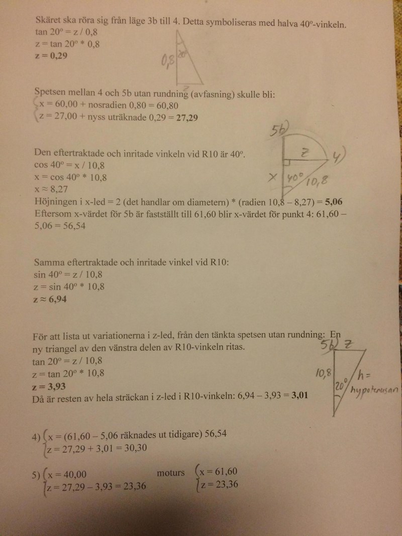 I x-led kan man i vissa fall behöva dubblera beräknade mått, för att det handlar om diameterprogrammering. Absolut programmering innebär att origo (alla linjers gemensamma nollpunkt) alltid är samma nollpunkt, den flyttas alltså inte. Att nosradien är 0,8 mm innebär att teorin måste justeras med 0,8 mm för att det ska fungera praktiskt. En rundning av skäret gör att räknar en bit in (0,8 mm) på skäret. Jag har med de genomgångar i boken som givits listat ut alla koordinater utan punkterna 4 och 5. Matematiker vet nog hur man ska rita trianglarna vid rundningen vid 4 och 5, men inte jag. Ett försök har gjorts av mig med en rät vinkel uppe i vänstra hörnet, en bit under rundningen.