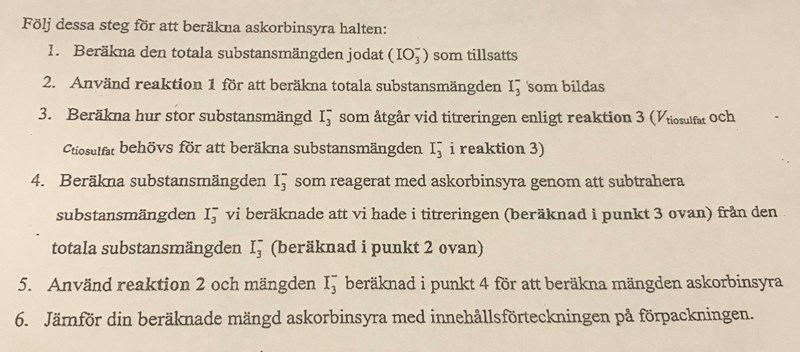 2. I resultatdelen skriver jag ner mina beräkningar, men för att beräkna askorbinsyra-halten har jag följt ett antal steg. Ska jag skriva upp dessa steg i metoden? Isåfall kan man kopiera och klistra in det från labbinstruktionen jag har?