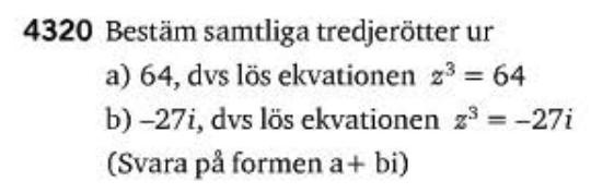 jag kommer fram till allt och lyckas liksom få det till att r=3 och v= 270+n360, men jag förstår inte alls hur jag ska lyckas skriva de svårare talen på formen a+bi.