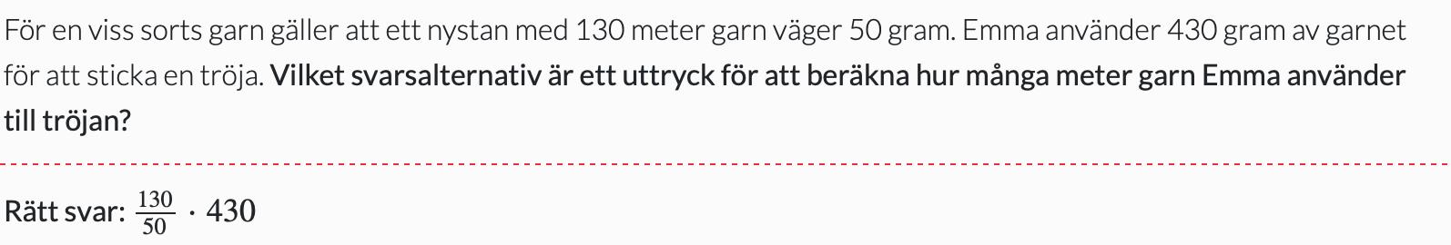 Kom ihåg att ekvationen i svaret är samma som 430/50 * 130. Jag tycker det är lättare att tänka 430/50 * 130m. Jag behöver 430/50st nystan, och varje är 130m långt.