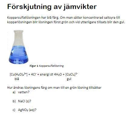 Mitt försök till ett resonemang: När man tillsätter silvernitrat kommer först en fällning av kloridjoner att bildas. Detta resulterar i att en ökning av partiklarna på reaktant sidan sker. Reaktionen kommer därför att skifta åt höger. Eftersom om koncentration av ämnen ökar på reaktantsidan ges möjligheten för fler kollisioner mellan Cu(H2O)42+ och AgCl, när fler partiklar kolliderar bildas det fler reaktanter än produkter. För att jämna ut reaktionen och nå jämvikt kommer reaktionen att tillfälligt skifta åt höger tills jämviktsläget är inställt igen.