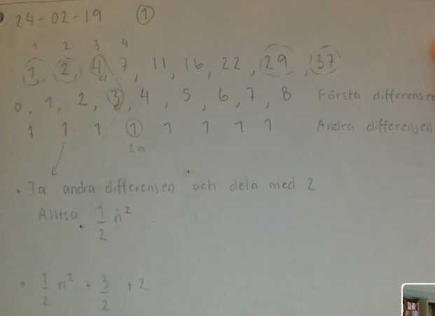 Differensschema är kraftfullt, men som uppgiften är formulerad räcker det att anpassa ax2+bx+c till de tre första talen, som vi kan låta höra ihop med x = 0, 1 respektive 2:
