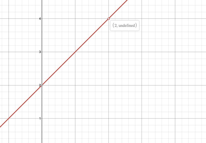 Vad det gäller påståendet, stämmer det: I ett fall som kan nämnaren gå mot noll, men täljaren är alltid ett. Då kommer funktionen att gå mot oändligheten, vilket innebär att det inte kan finnas ett gränsvärde. Om vi däremot har funktionen kommer både täljare och nämnare att bli noll då funktionen går mot x = 2. Då kan det finnas ett gränsvärde i punkten. Om vi undersöker saken kommer vi mycket riktigt att hitta gränsvärdet fyra. Om vi ritar upp funktionen i en grafritande miniräknare ser vi att värdet på funktionen kommer att närma sig fyra, men att det finns ett "hål" i funktionen då x = 2: