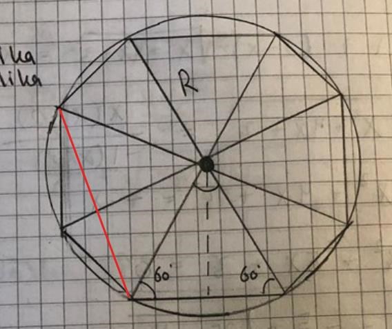 Du har antagit att vinkeln är 60 grader men det blir 60*8 = 480 grader i mitten... men de får inte plats och vinkeln in mot mitten måste därför vara mindre.