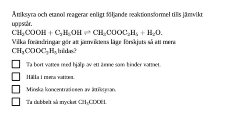 I det tredje alternativet kommer koncentrationen av ättiksyra minska då kommer koncentrationen av C2H5OH att öka, reaktionen kommer gå åt vänster och därmed kommer inte koncentrationen av CH3COOC2H5 att öka. Därför är det här påstå det felaktigt.