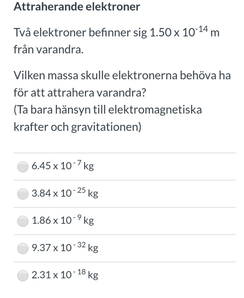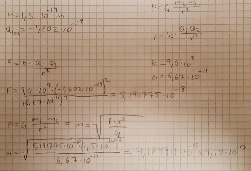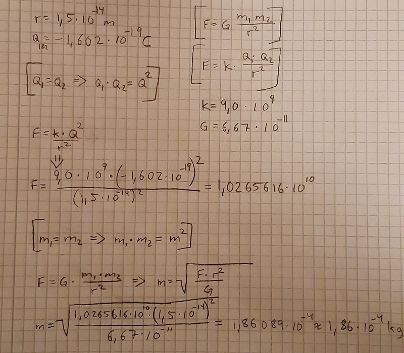 "För att elektronerna skall attrahera varandra krävs att gravitationskraften är större än den elektriska Coulombkraften. Eftersom det handlar om två elektroner, är deras massa lka och laddigen är lika. Vi behöver alltså inte två olika variabler för de båda massorna respektive laddningarna. Gravitationskraften är och Coulombkraften är . Det innebär att . ..."