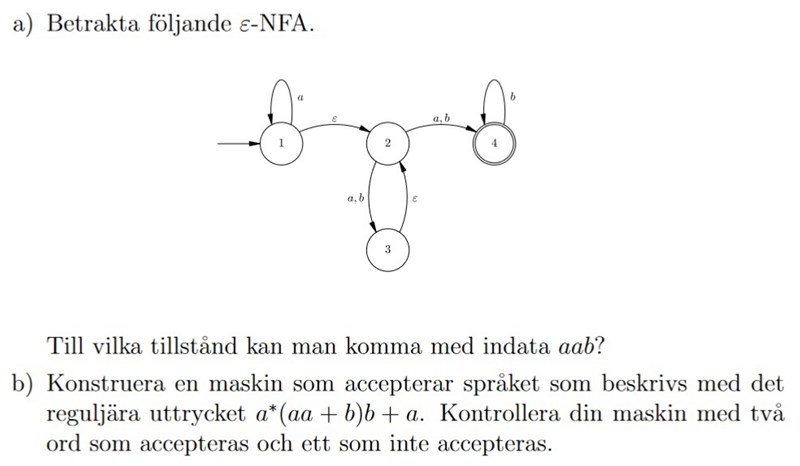 Frossel skrev:Denna fråga dök nyligen upp på ett diagnostiskt test och jag har helt glömt bort hur man räknar med automater, kommer inte ens ihåg vad epsilon betyder i den här kontexten.