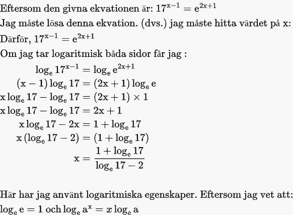 Frågan: Lös ekvationen 17^x-1= e^2x+1. Svara både exakt och med tre gällande siffror.