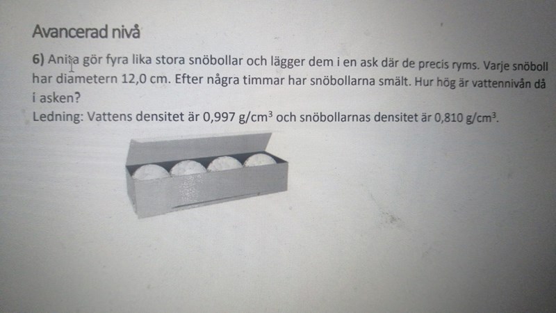 Fråga: Anita gör fyra lika stora snöbollar och lägger dem i en ask där de precis ryms. Varje snöboll