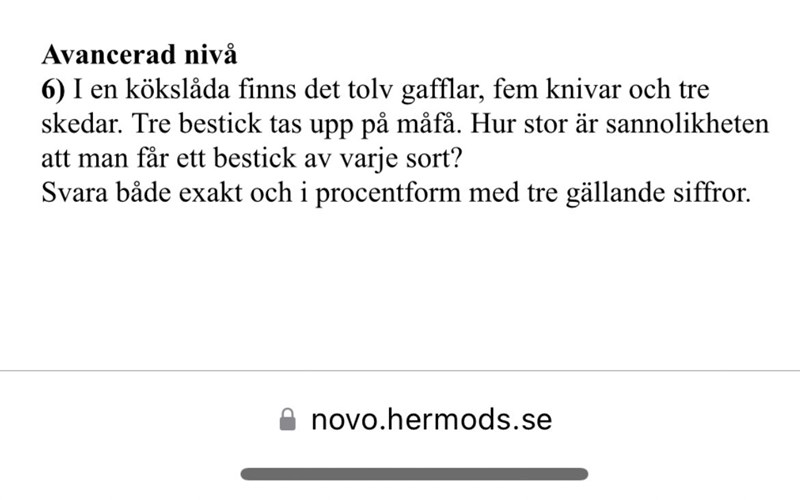 Nu har du räknat ut sannolikheten för att ta först en gaffel, sen en kniv, sen en sked. Du har 6 olika ordningar att plocka i, som du behöver räkna ut och lägga ihop.