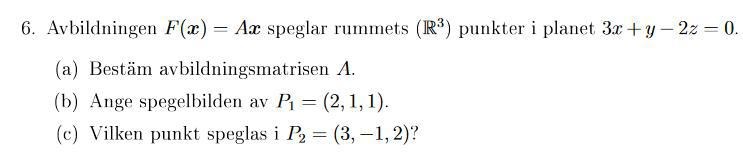 Jag skulle nog ta fram planets normalvektor och sedan en ortogonal bas i planet. Dessa vektorer är egenvektorer till A med kända egenvärden. Kombinera avbildningarna för att hitta bilder av standardbasens basvektorer.