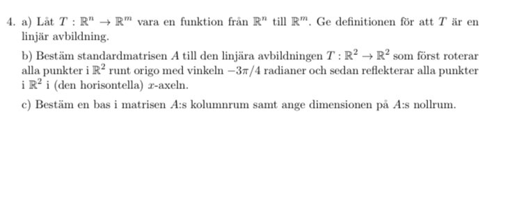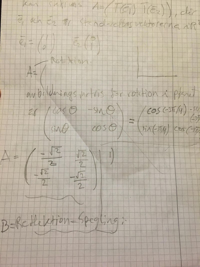 Hej, jag behöver hjälp med att hitta avbildningsmatrisen för denna frågan. Jag har hittat matrisen för rotationen, men jag vet inte hur ska jag hitta matrisen för speglingen. Därmed kan jag hitta avbildningsmatrisen som är D=B*A