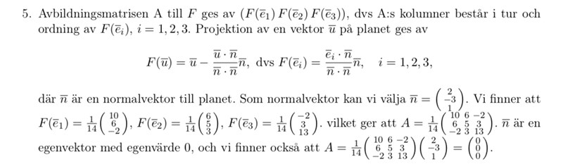som är normalvektor till samma plan A avbildar vektorer till. Då kommer du få nollvektorn eftersom normalvektorn n inte har någon komponent i planet. Facits sätt är ett vanligt sätt att beräkna en avbildningsmatris på. Kan vara bra att memorera den metoden.