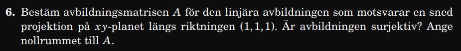 Skall vi hitta hur som (1,0,0) avbildas längs riktningen (1,1,1) vill det till att vi rör oss med riktningsvektorn t*(1,1,1), där t är vald så att vi stöter på xy-planet. Vår vektor skall alltså avbildas till (1,0,0)+t*(1,1,1)
