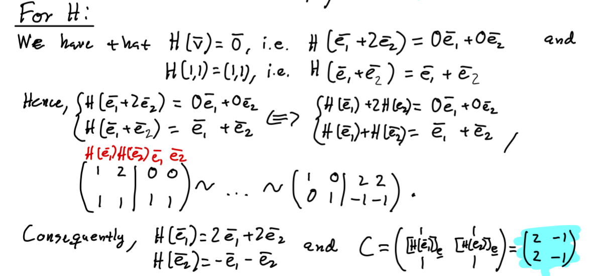 Det är detta som utnyttjas för att hitta hur avbildningen H avbildar standardbasen, vilket i sin tur hjälper oss att ställa upp avbildningens standardmatris.