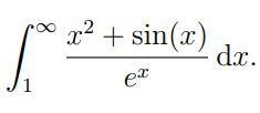 Termen sin(x) kan man kasta bort, för den är mindre än eller lika med 1, och täljaren är alltså mindre än eller lika med x2+1, och det är mindre än eller lika med 2x2. Så den intressanta integranden är x2e-x.
