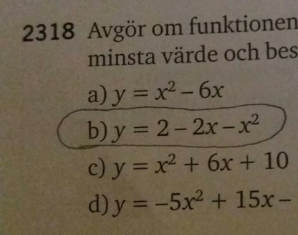 Det står ”-x^2” det ska alltså vara en ledsen mun. Dvs ett maximivärde. Stämmer det? Visst ska man inte förenkla uttrycket dvs göra om -x^2 termen till x^2 utan det gör man endast när man ska beräkna nollställen?