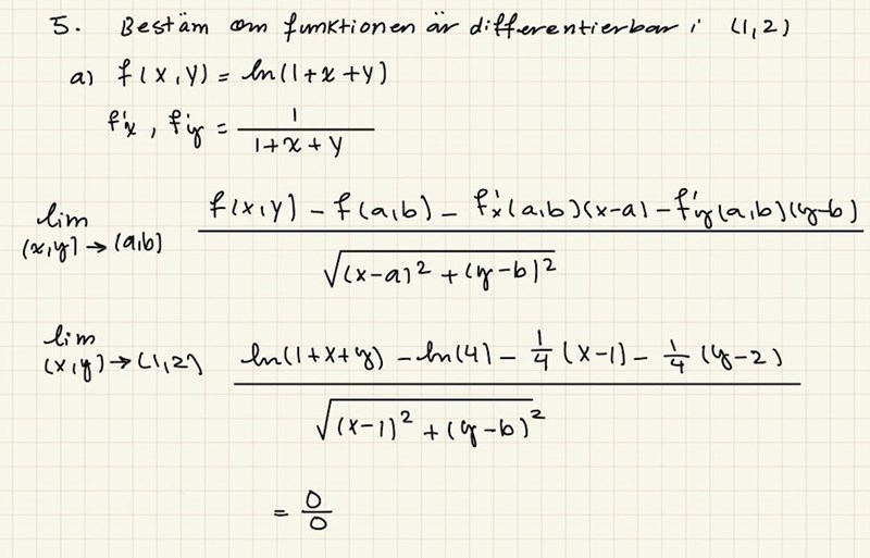 Har fastnat här med hur man avgör om en funktion är differentierar. Ska man undersöka gränsvärdet mha l'Hopitals regeln som vanligt och se om gränsvärdet går mot 0?