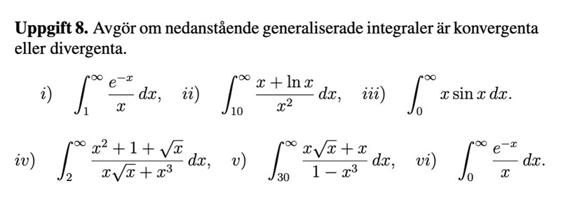 Calle_K skrev:Du behöver inte beräkna integralerna, bara avgöra om de är konvergenta eller ej.