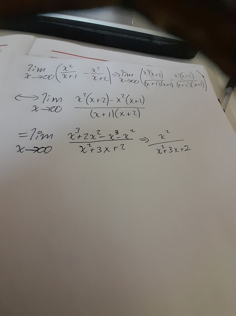 Du tappade bort lim vid sista implikationspilen. Bryt ut x2 både i täljaren och nämnaren och låt x gå mot oändligheten. Vad händer?
