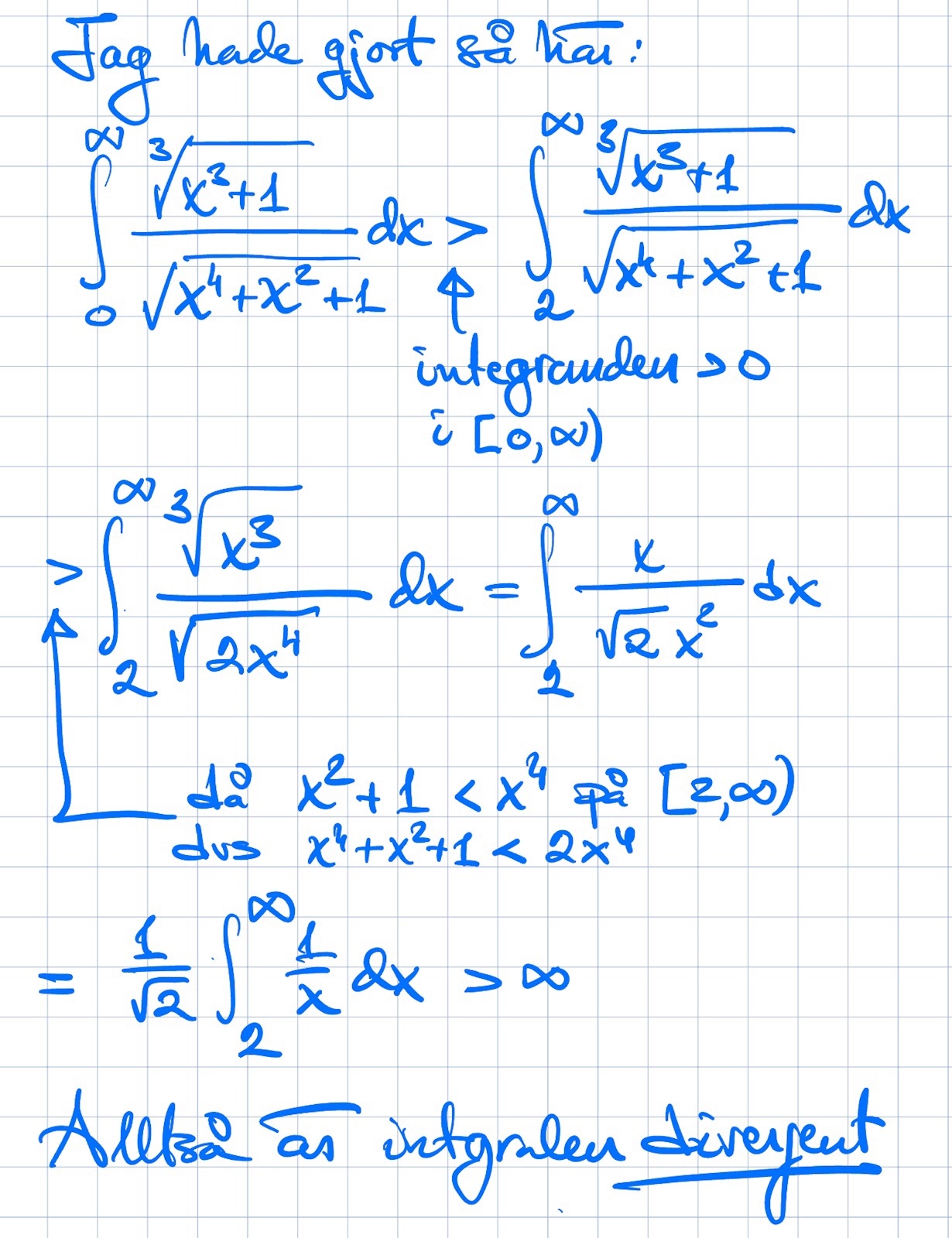 Facit säger att integralen är divergent men det finns ej lösningsförslag, så jag vet inte om jag har tänkt på rätt sätt eller om det bara är en slump att jag råkat få rätt svar.