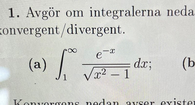 Hej! Jag har fastnat på en uppgift där man ska avgöra om en integral är konvergent eller divergent. Den är generaliserad på två sätt, först att intervallet är mot plus oändligheten samt att den inte är kontinuerlig i 1.