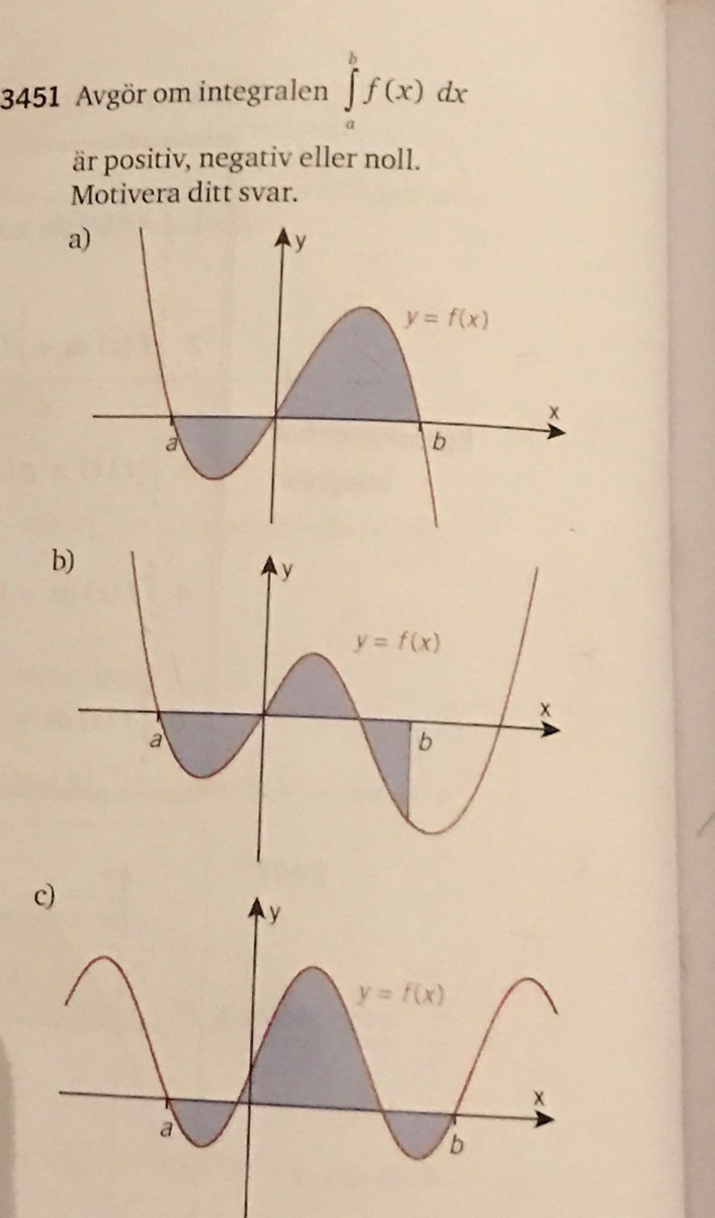 Jag har tänkt så men c) gör det svårt för mig.. jag ser att övre område är ju större därav är den positiv men enligt facit är det negativt? Och i b) är det halv sådär att avgöra.. jag tänker att det är svårt för mig att skapa bilden över den sammanlagda områden under grafen exempelvis i uppgift c)