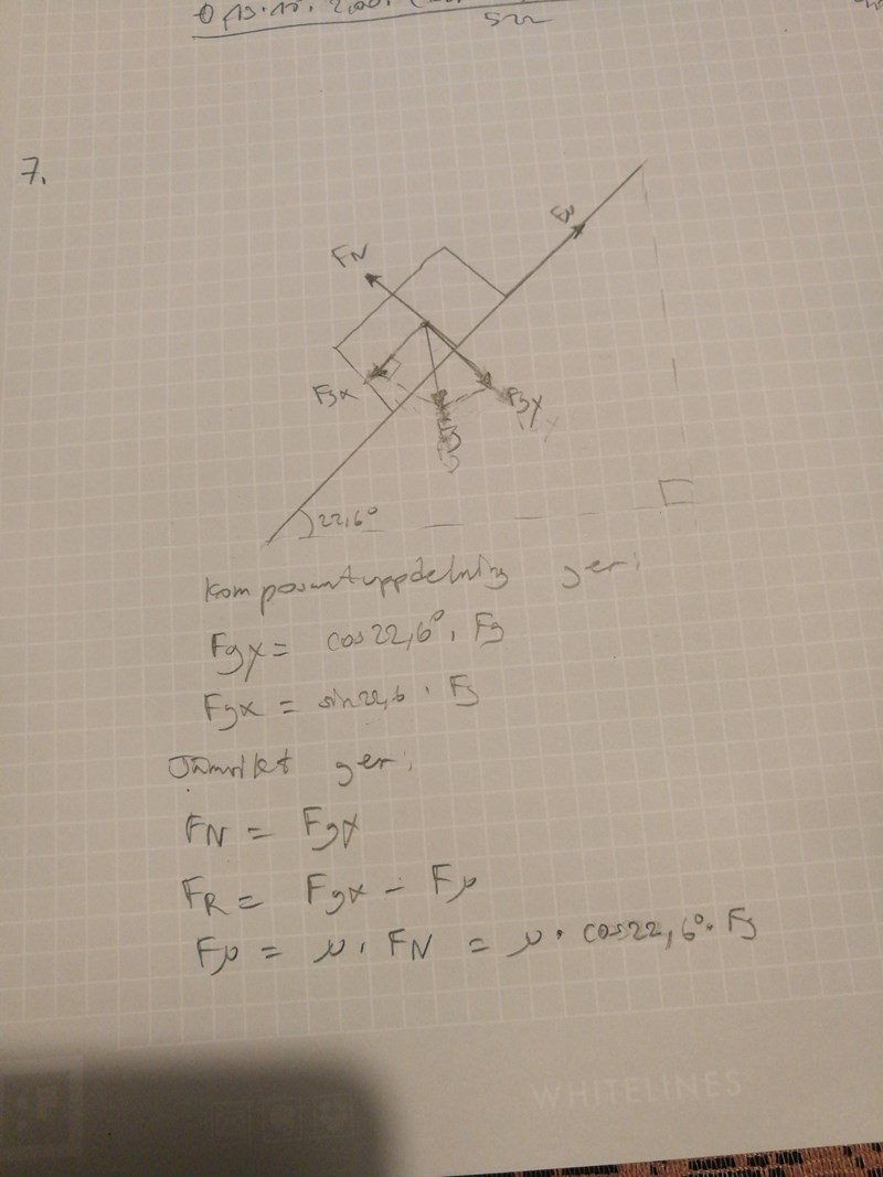 Laguna skrev:Räkna ut tyngdkraftens kraftkomposant längs ytan som klossen ligger på, och se om friktionskraften räcker för att stå emot den.