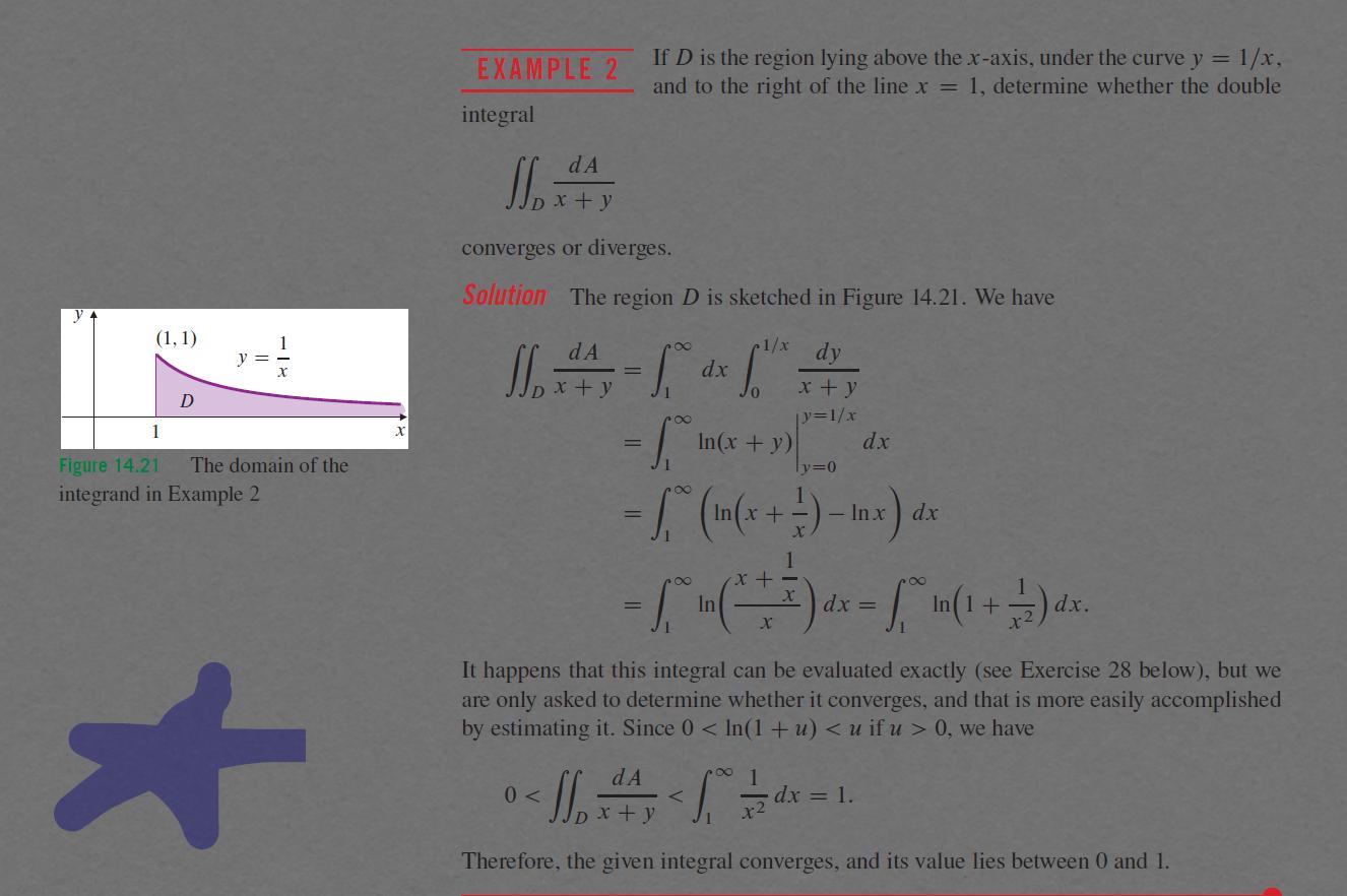 Det vi ska räkna ut kan ses som en volym, ja. Det kan vara något annat, det har vi inte fått veta. Resultatet är ett tal, helt enkelt. Är du med på den långa omskrivningen efter "Solution"? Den sista integralen där ser inte ut som en volym, antar jag, men det är samma tal som vi hade från början (om det nu är ett tal alls). Nu tar vi en annan integral som är större än den första, visar att den är konvergent, och då vet vi att den första är det också.