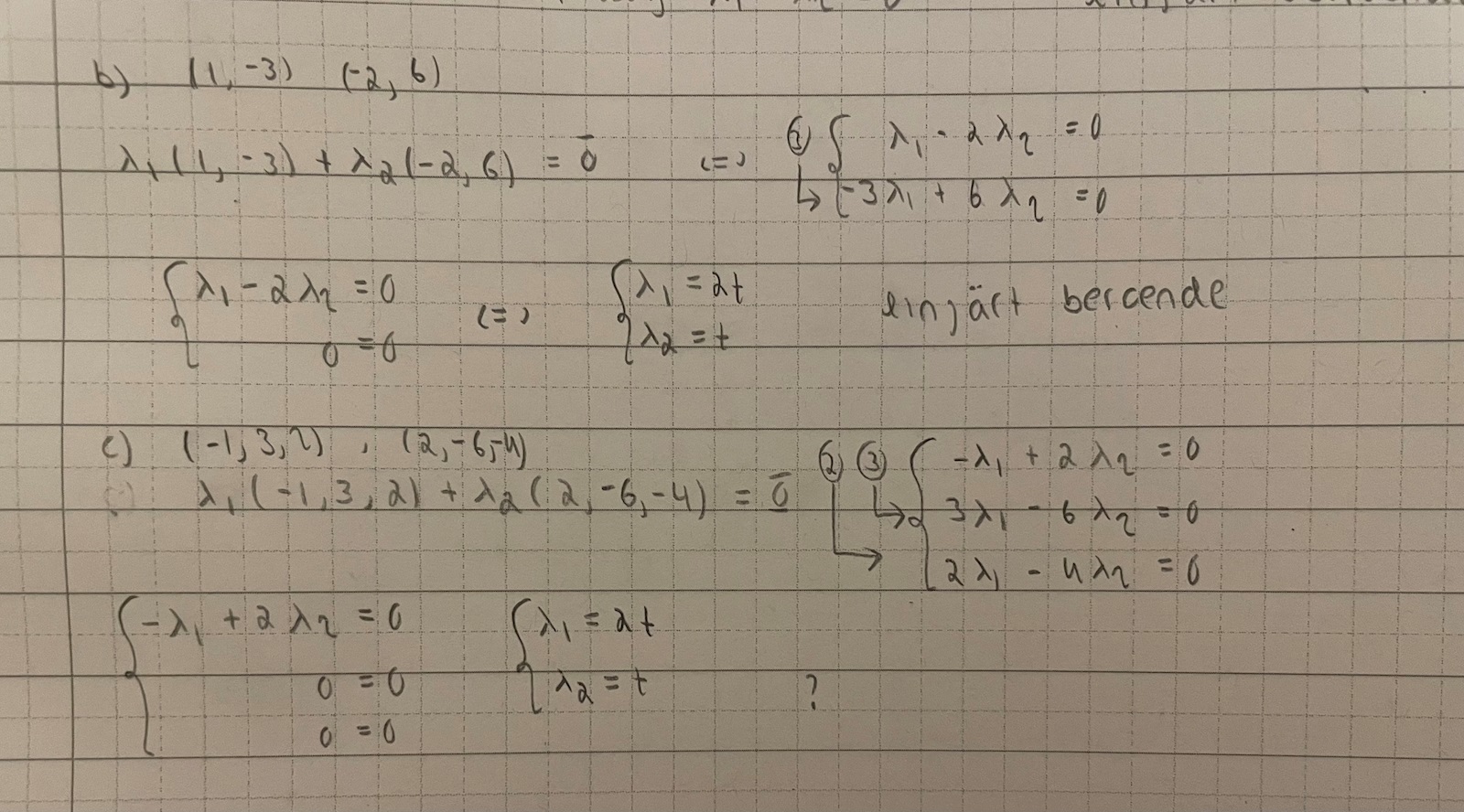 Först ut är vektorerna (1,-3), (-2,6) i uppgift b). Då kommer jag fram till att de är linjärt beroende då jag får en parameterlösning.