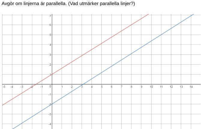 Jag förstår inte riktigt hur jag ska tänka. Jag började med den röda och då försökte jag se en tydlig punkt hittade då 8,6 men fattar inte hur jag ska göra nu. Jag har tidigare lärt mig att två parallela linjer är linjer som aldrig någonsin kommer mötas. Min första gissning var att dessa var det eftersom att de ser parallela ut, men så ska man inte göra eftersom de så småningom kommer mötas. Vet att man ska kolla på k värdet men kan inte sätta det i ett sammanhang.