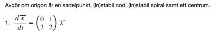 Avgör om origon är en sadelpunkt, instabil nod, instabil spiral samt ett centrum