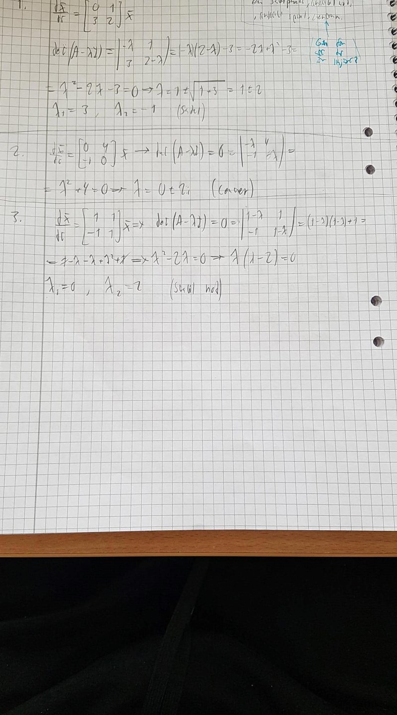 Hej! Jag undrar hur jag ska kunna lösa denna? Jag tänkte först att jag tar fram den karakterisktiska ekvationen och löser ut de kritiska punkterna. Sedan tänkte jag att jag undersöker de kritiska punkterna med jacobianen. Dock förstår jag inte hur jag ska ta reda på om kritiska punkten jag undersöker är ett centrum? Behövs det inte en annan metod för det?