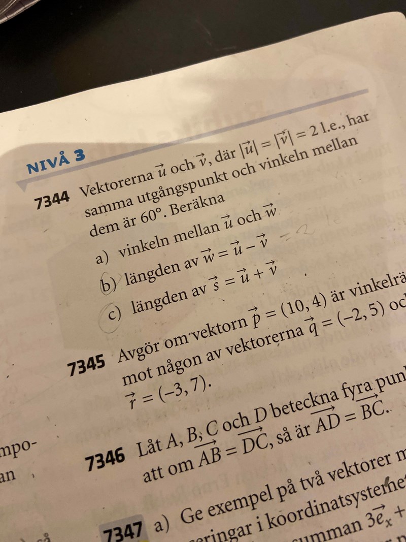 jag har fastnat på 7344 c} och förstår ej hur man gör? A är 60 grader och det ser man eftersom den har två likadan sidor vilket resulterar att det blir en liksidig triangel på w. E är alltså 2l.e