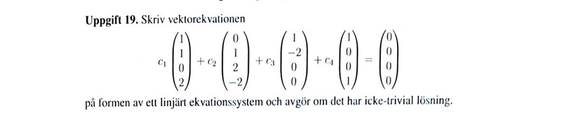 Jag vet ej om det här är bra svar på frågan,men kan man ej tänka att eftersom vi har skrivit vektorekvationen på linjärt ekvationssystem så har vi nu lika många ekvationer som obekanta. Alltså har vi en icke trivial lösning och sen ser man ju att vi har egentligen homogent linjärt ekvationssystem på bilden vilket alltid har en lösning?-1-(1).jpg?width=800&upscale=false)