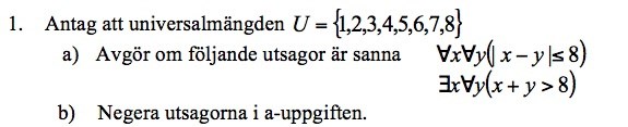 b) Tror det står för minst ett x och för alla y. Om x = 8 och y = U så blir det ju alltid större än 8 så tror den också är sann?