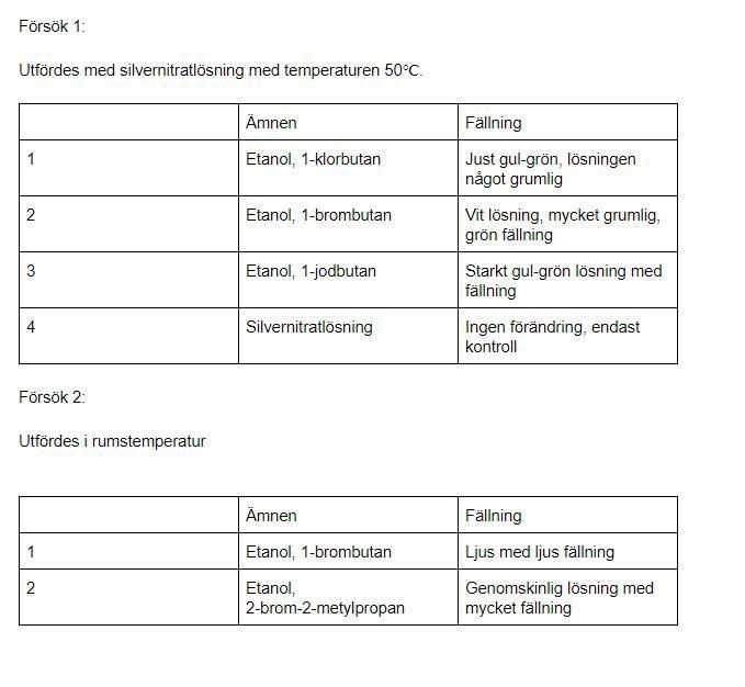 Uppgiften är att jag ska redovisa en labb på substitutionreaktioner. Jag ska alltså inte skriva en labbrapport utan endast redovisa och analysera resultaten. Har fått dessa resultat av en kurskompis eftersom jag själv inte kunde vara med på labben:
