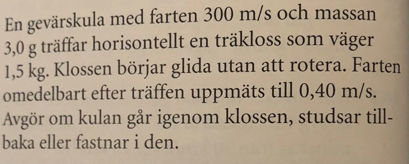 Räkna på rörelsemängdens bevarande. Om du sätter kulans riktning innan träffen som positiv och kulan får en negativ hastighet efter träffen har den studsat tillbaka. Tänk på samma sätt för att avgöra om kulan går igenom klossen eller fastnar i den.