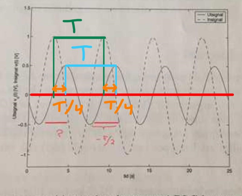 här är ännu ett ex. på där jag inte vet hur jag ska avläsa plotten där de säger att fasvridningen är -pi/2... jag har markerat ut med röda streck där jag tolkat det som är själva fasskillnaden på -pi/2 men jag vet ärligt talat inte hur de kommit fram till det.
