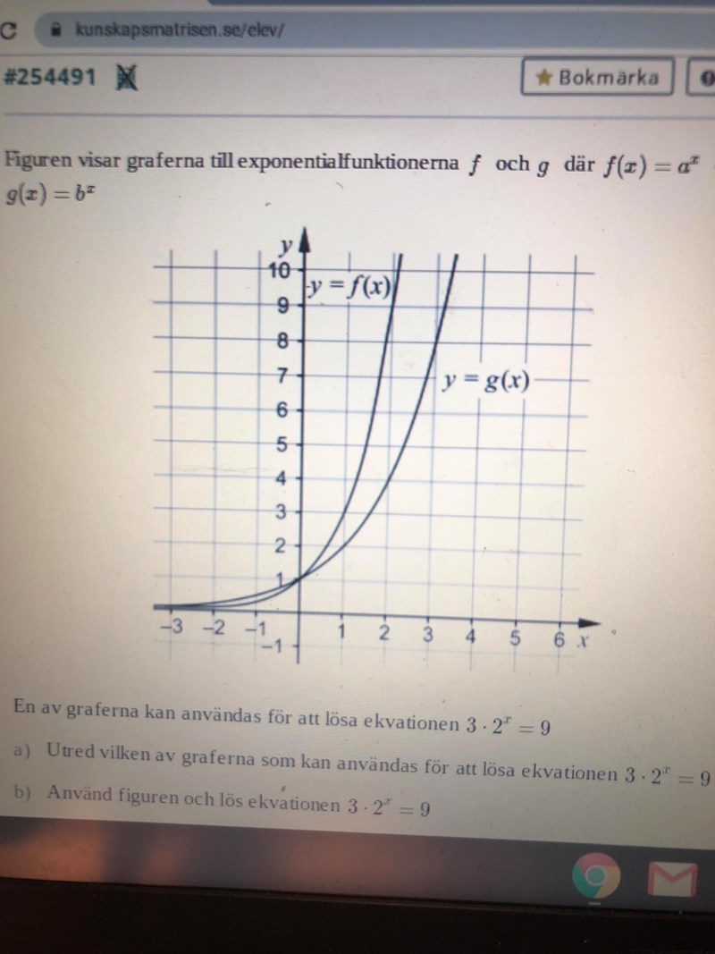På a-uppgiften skall du förklara vilken av de båda funktionerna man kan använda för att lösa ekvationen 3*2x = 9. På b-uppgiften skall du (verkligen) lösa ekvationen. Så om "Svar : g(x)" är svar på a-uppgiften är det rätt (men knappast tillräckligt), om det är svar på b-uppgiften är det fel.