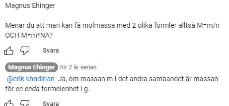 1. molmassa kan fås genom M=m/n OCH M=m*NA?