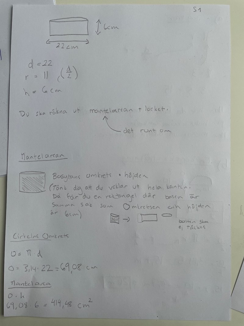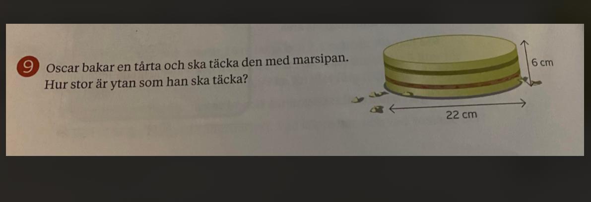 Det ser ut som tårtan är cylinder formad.... man kan se den som två ihopsatta delar. En topp som är en cirkelformad area plus kanten runt som är mantelytan på en cylinder.