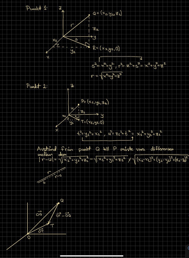 Hej, försöker uttrycka avståndet mellan två punkter genom att ta differensen av deras individuella avstånd till origo. Går det inte att göra på de sättet? Får inte den vanliga avståndsformeln
