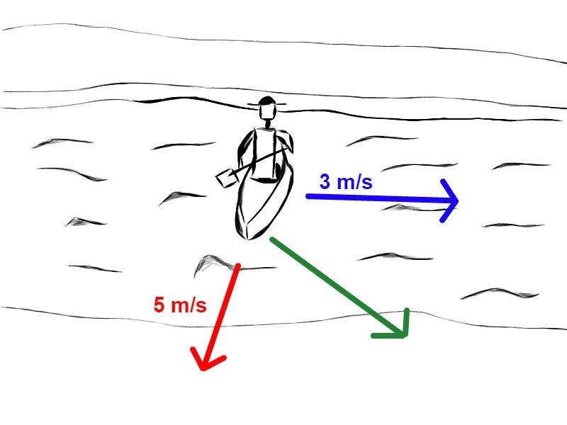 Mattehjalp skrev:En scout paddlar i en älv som forsar fram med hastigheten 3 m/s. Scouten paddlar med hastigheten 5 m/s i förhållande till vattnet. Älvens bredd är 60 meter. Beräkna hur långt ifrån punkten p som scouten hamnar(punkten p ska vara där den röda pilen pekar.