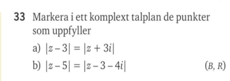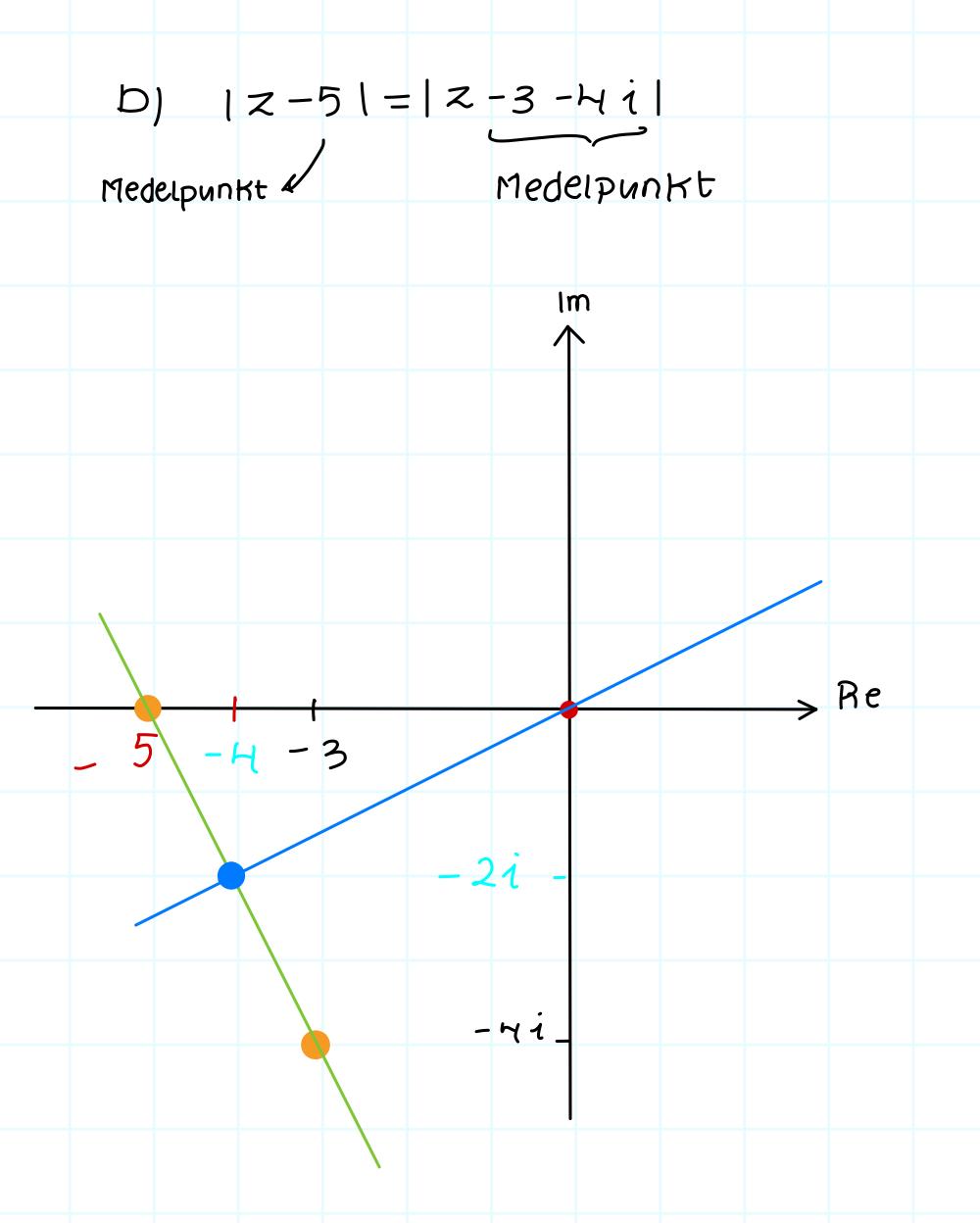 Jag löste uppgiften genom att markera-5 och (-3-4i) i talplanet för att sedan dra en linje mellan de. Sedan föröskte jag hitta ett en punkt som var lika långt ifrån -5 och (-3-4i) på den uppritade linjen(-4,-2i). Efter det markerade jag en punkt på orgi och drog en linje som gick igenom punkten (-4,-2i) samt (0,0).