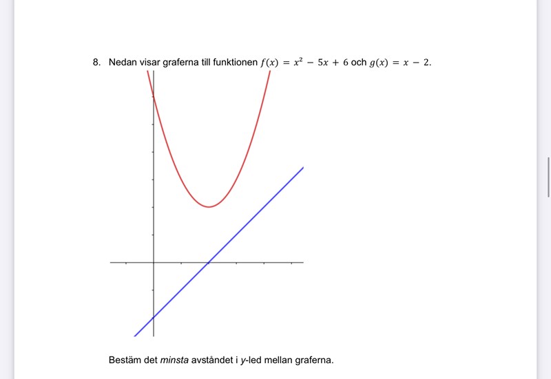 Bestäm det minsta avståndet i y-led mellan graferna f(x) = x2 - 5x + 6 och g(x) = x - 2